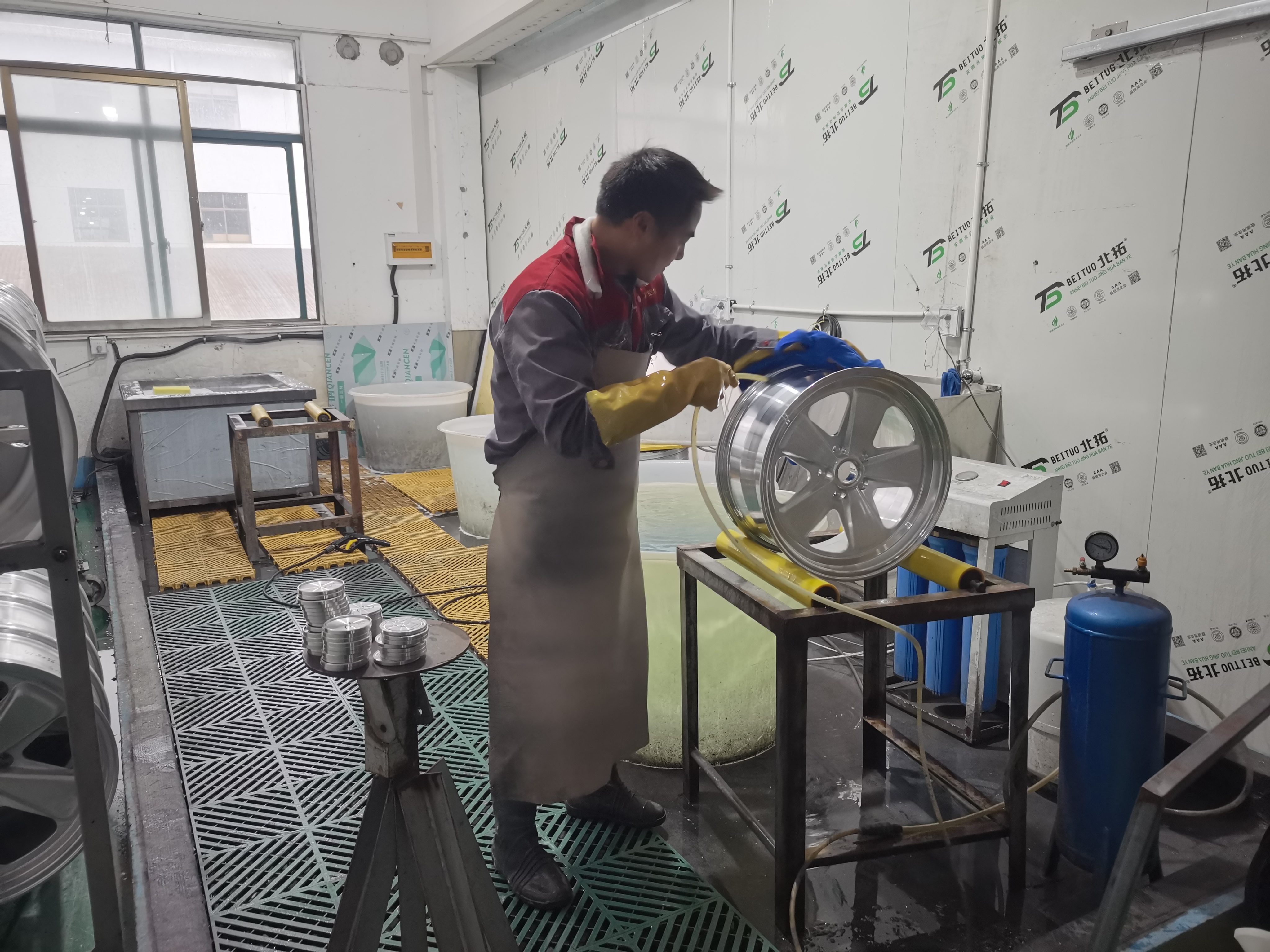 After manual preparation, all forged wheels go through a 7-stage pre-treatment cleaning process to eliminate contaminants before powder coating. This pre-treatment ensures a significantly stronger and more uniform finish after the powder coating application.